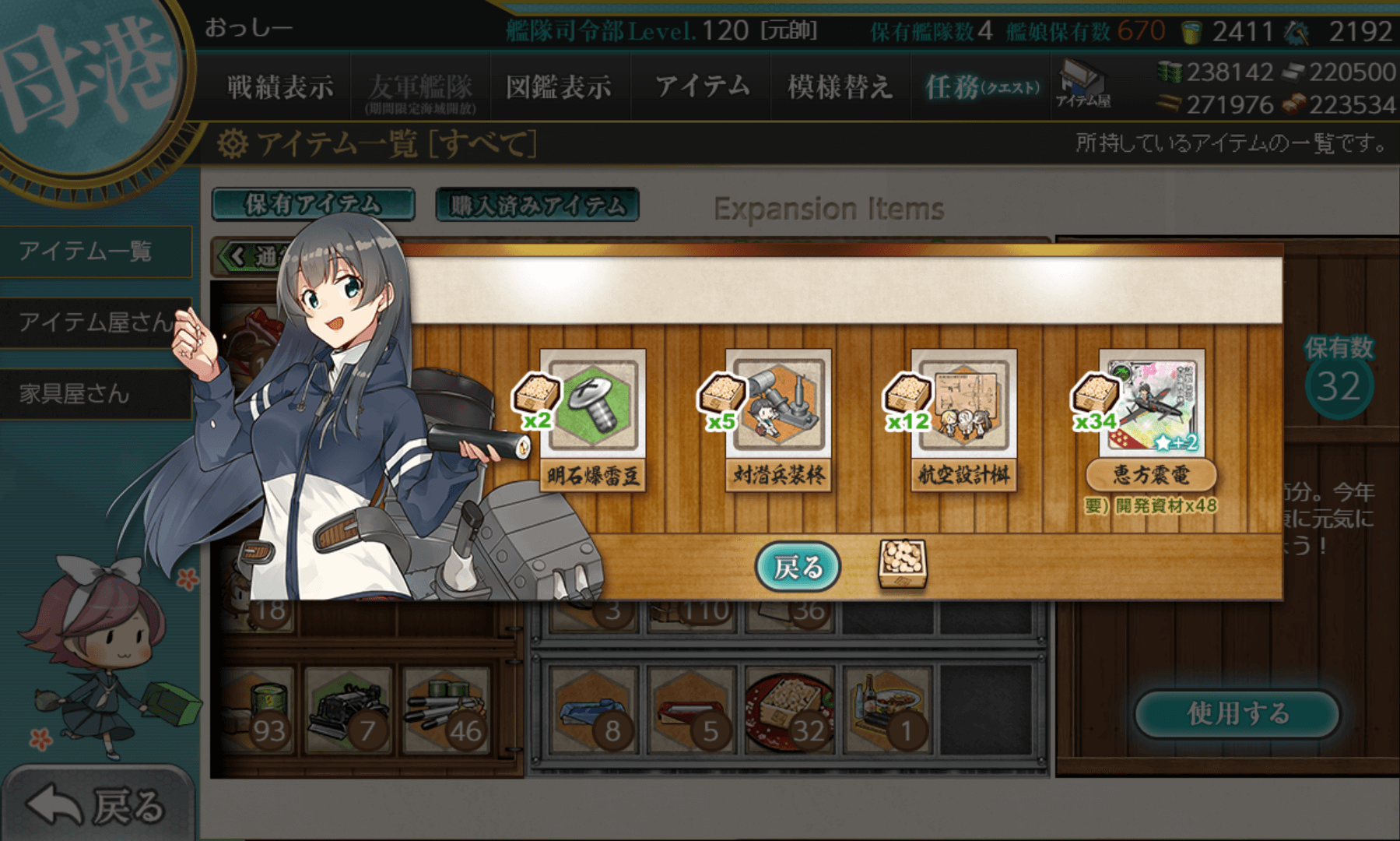 改装レベル79、改装設計図、新型兵装資材×2、開発資材×78となっています