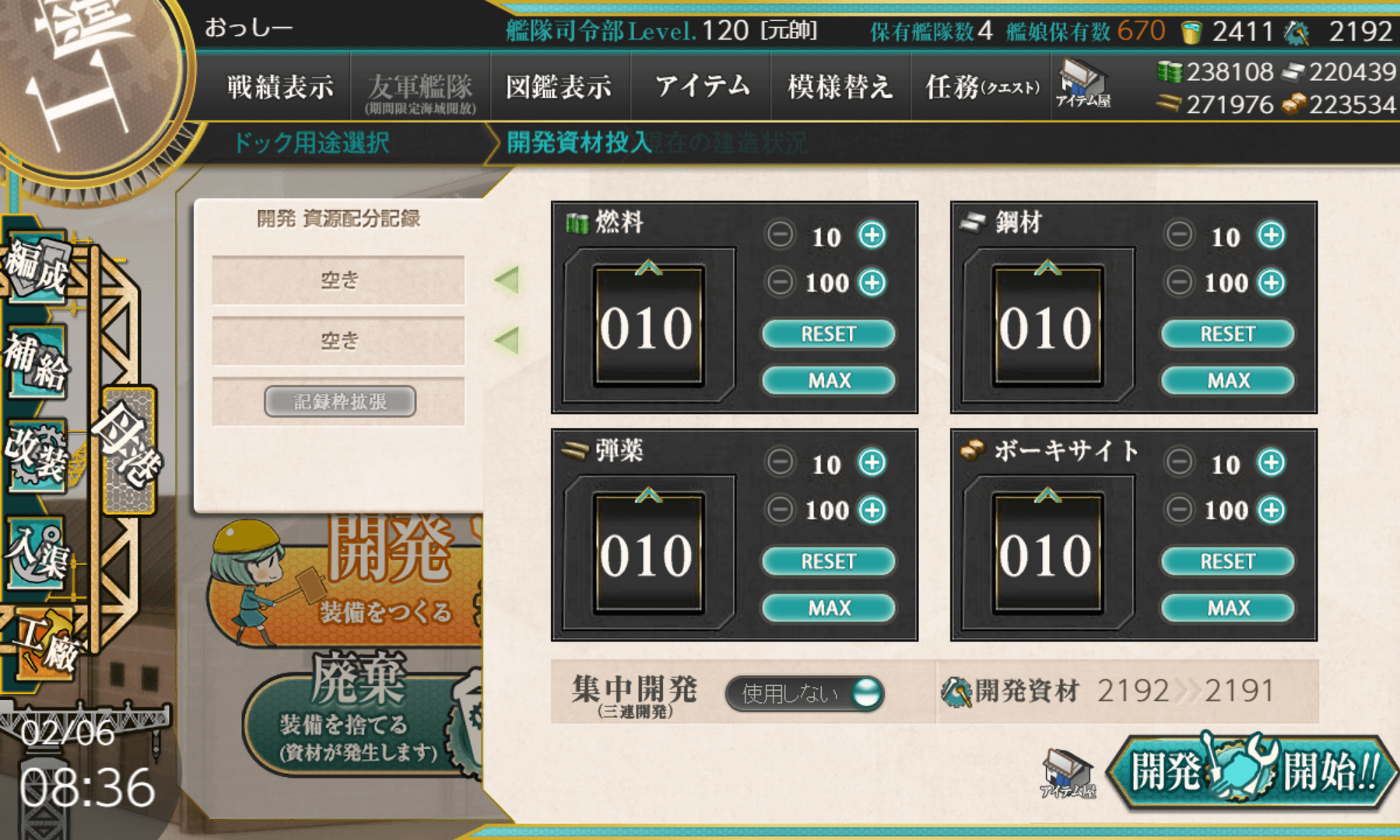 開発レシピの記録は工廠拡張セットを買って増やすようですね