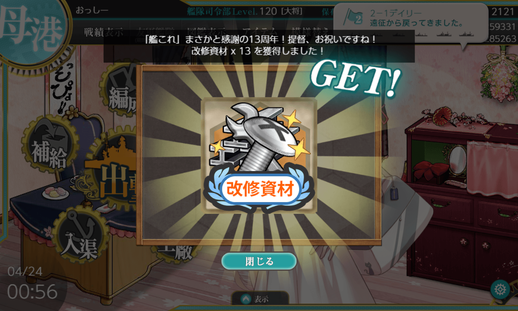 艦隊13周年のお祝いと感謝として、艦隊戦力の増強に役立つ #改修資材 も【13個】贈呈いたします!