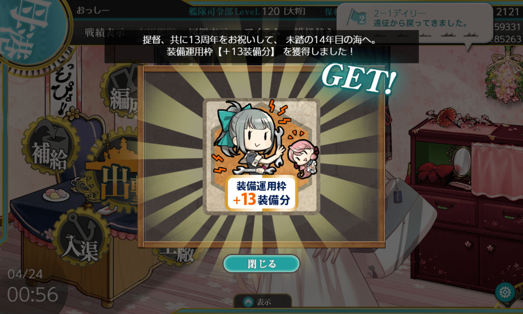 艦隊13周年の感謝として、全ての提督の皆さんに貴重な #装備運用枠【13枠】無償拡張を実施いたします!